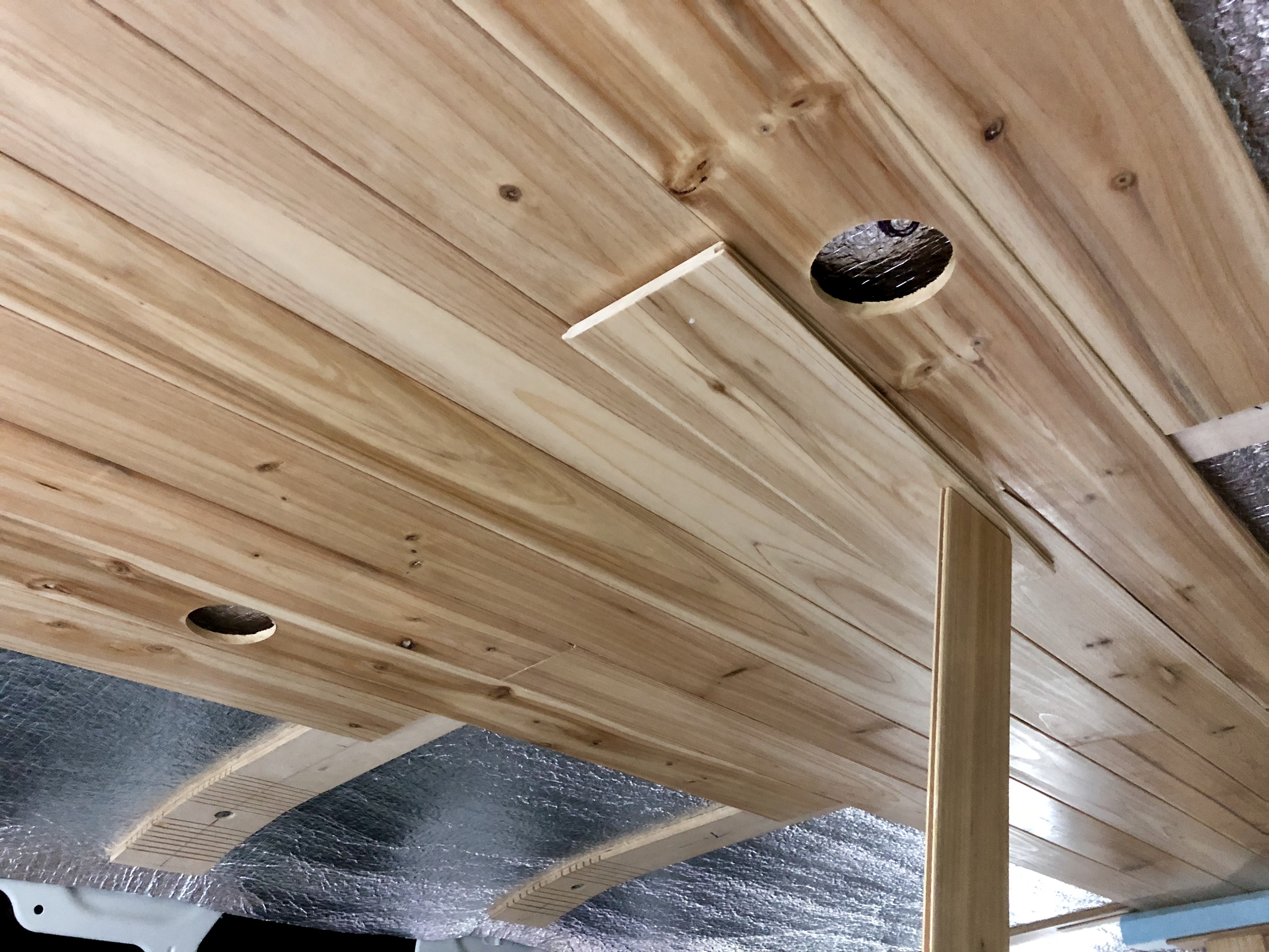 As we feared, the curves at the front of the ceiling made things extra challenging today. The van roof slopes from the center to the edges, but of course at the front it also slopes down. These compound curves caused some tough gaps in the planks as we tried to install toward the front today. Think of wrapping a flat board over the surface of a ball. As you move out from the very center of the ball the middle of the board has a gap relative to the two ends. So the tongue and groove fits nicely at the ends, but not so much in the middle.